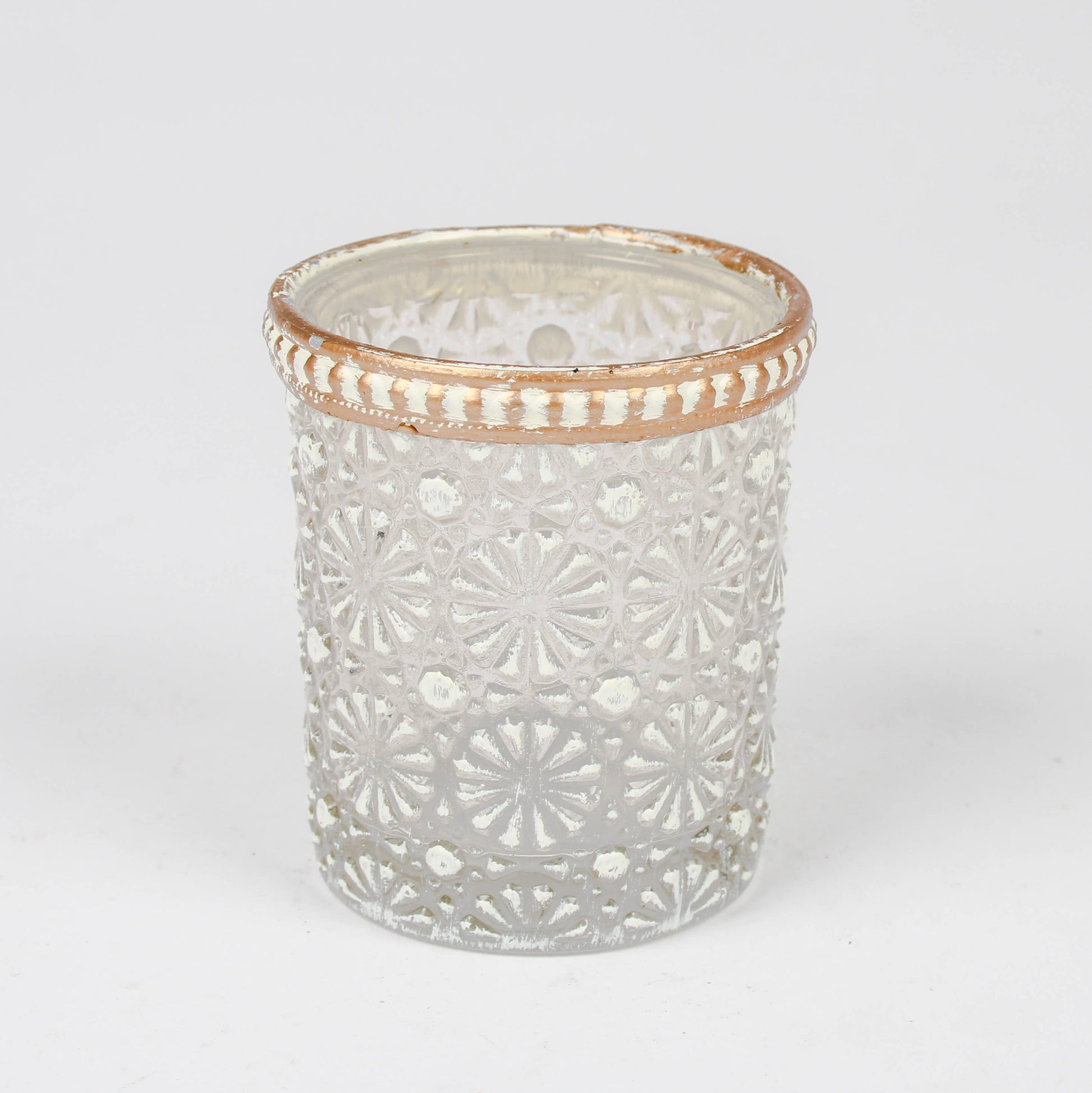 Daisy Pattern Glass Tea Light Holder With Metal Rim